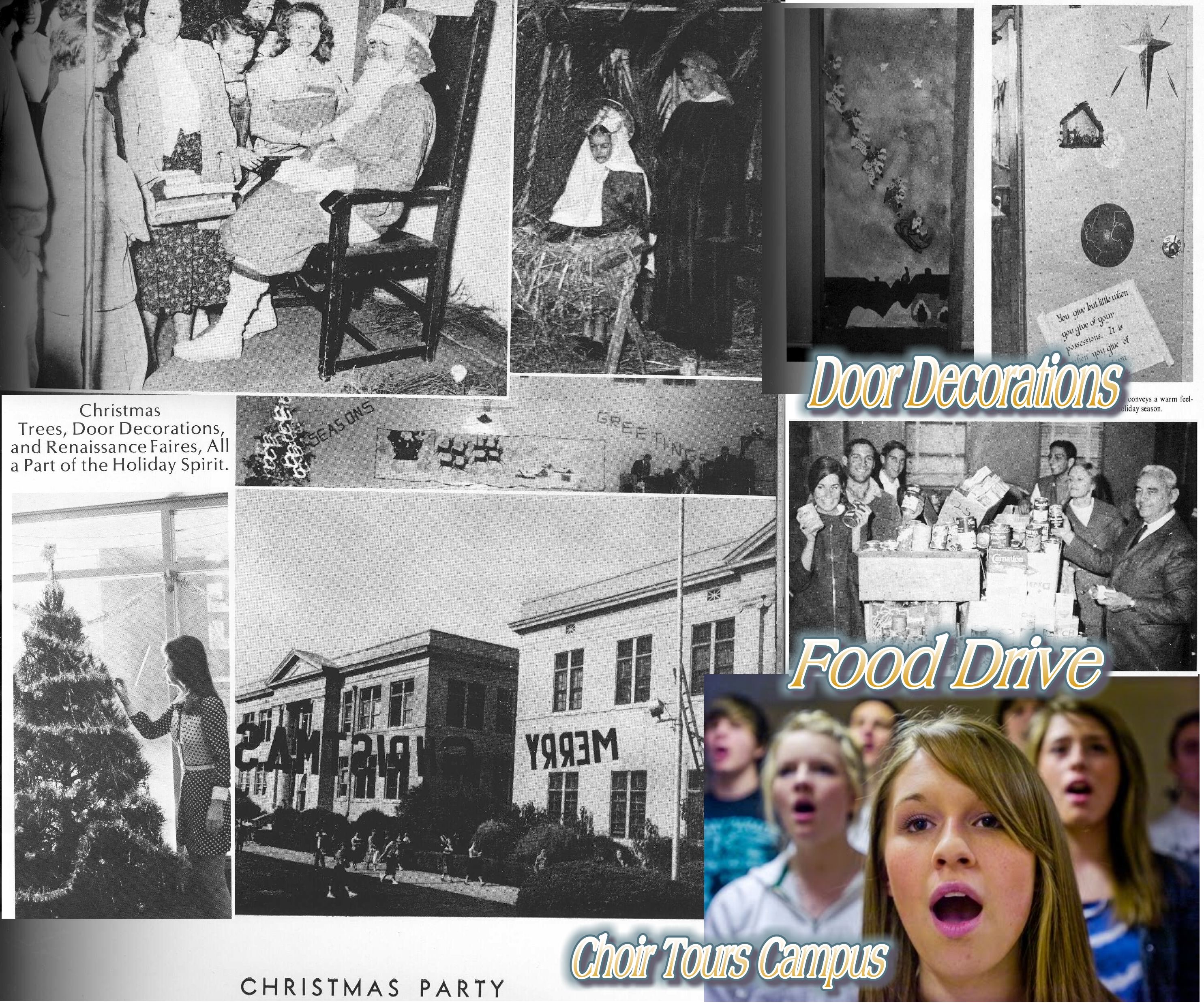 Orange High has had many Christmas traditions that have come and gone. In the early years, there was the Christmas Party with Santa, school decorations, a Nativity and assemblies and concerts. Food drives have collected items for the needy at the holiday season. We used to decorate our classroom doors like holiday cards for a contest. A brass sign was attached to the winning doors. The Choir would walk through the campus singing carols.