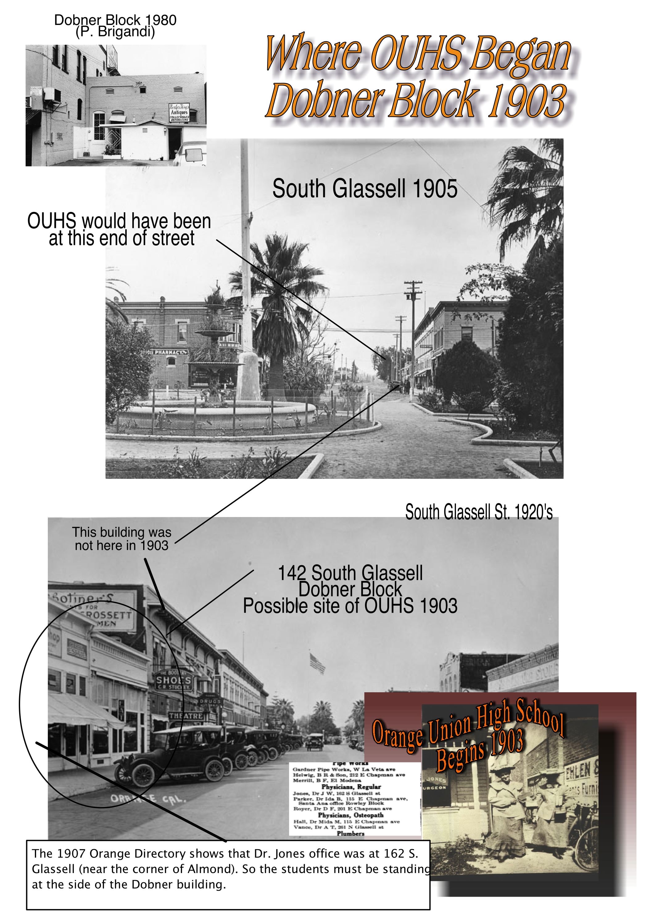 When the school bond election of 1903 was declared illegal because one polling place closed early, there was no money to build a High School. Mr Dobner offered one of his buildings for rent. It was described as a building of three stores in the Dobner block on South Gassell St. In the picture below (bottom left) you can see two buildings near the corner of Almond and Glassell (in circle). The one with no awning has two stores (it is still there today). The building with an awning has more stores. A picture in the city library of this building shows three stores. This must be where OHS began. The building was torn down in 1950 to make room for a market. The color photo shows two 1903 students. To their left is Dr. Jones office, which is listed as 162 S. Glassell, in the 1907 Orange directory. The Dobner building is listed as 142 S. Glassell. See the “Dioramas” section of this website for a model of what the Dobner building might have looked like.