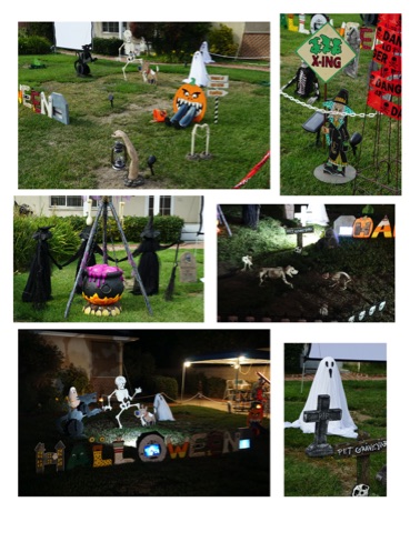 To the left are pictures of this years yard display. New this year is the Happy Halloween sign in the center of the yard with videos in the letter "O" and at each end.
